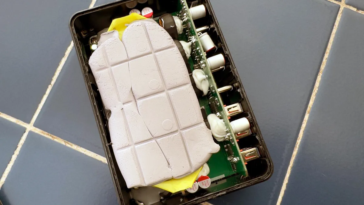 The first thing that greeted me was… a piece of something. At first glance, it looked like a thermal compound, but it smelled and felt like window glazing compound, leaving an oily residue behind. It was also surprisingly heavy, almost as if it was added to give the charger some artificial weight. Without it, the remains of the Charger felt incredibly light.