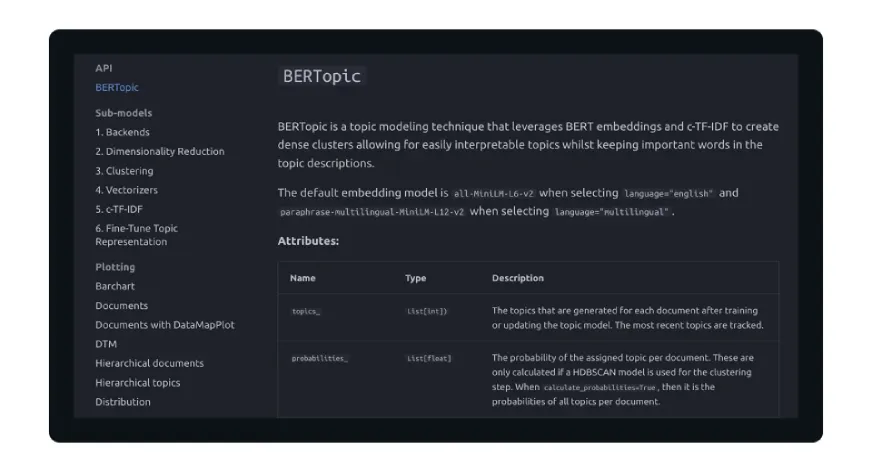 Instead of relying solely on word frequency, BERTopic takes advantage of the structure of the semantic space to identify patterns in text data. Its modular design makes it well suited for a wide range of applications, from analyzing customer feedback to organizing research documents.