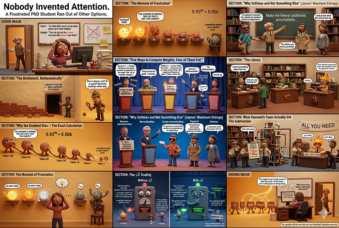 The article discusses the journey of Dzmitri Bahdanou, who faced challenges due to the limitations of encoding long-range dependencies, while trying to improve long sentence translations with neural networks. It explores the mathematical constraints and problems associated with traditional RNN architectures, leading to the development of attention mechanisms that redefined the way models handle information, allowing better management of memory in translation tasks, ultimately emphasizing that the main innovations came from addressing practical questions in machine translation rather than merely theoretical constructs.