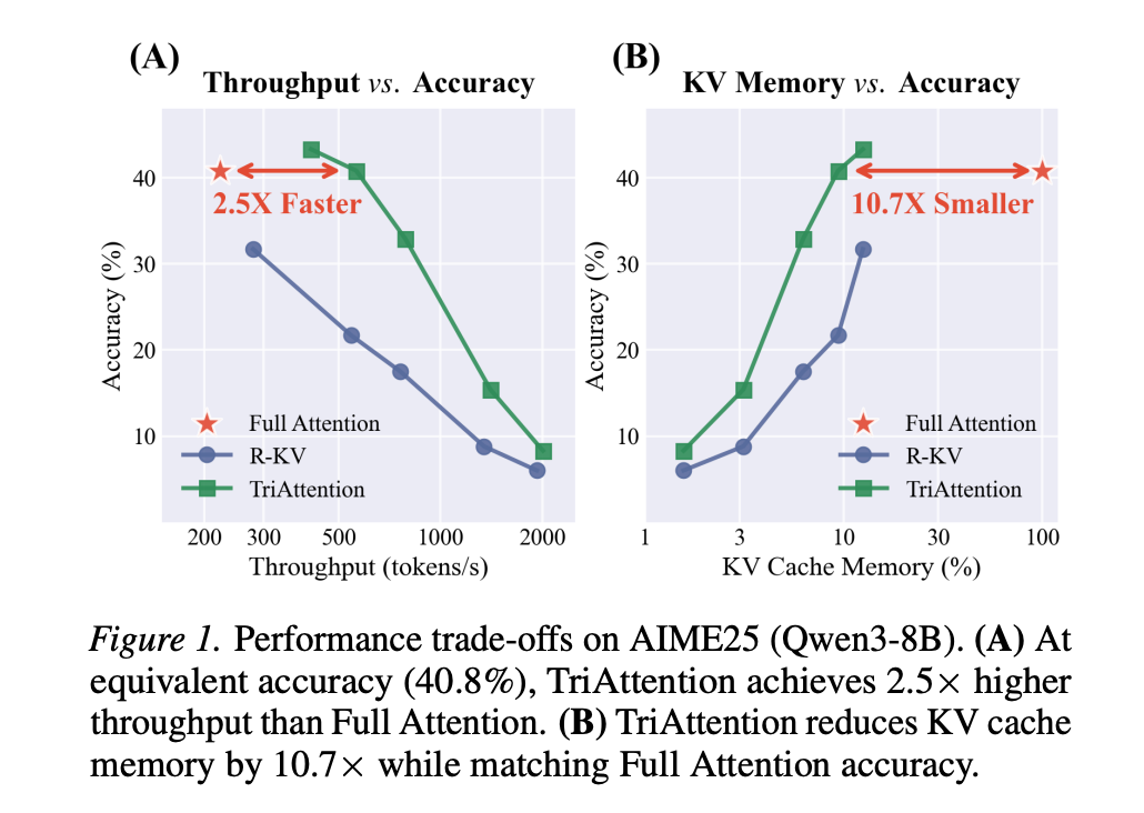 A team of researchers from MIT, NVIDIA, and Zhejiang University proposed a method called tridhyana Which directly solves this problem. On the AIME25 mathematical logic benchmark with 32K-token generation, TriAttention matches full attention accuracy while achieving 2.5× higher throughput or 10.7× KV memory reduction. Leading baselines achieve only half the accuracy at the same efficiency level.