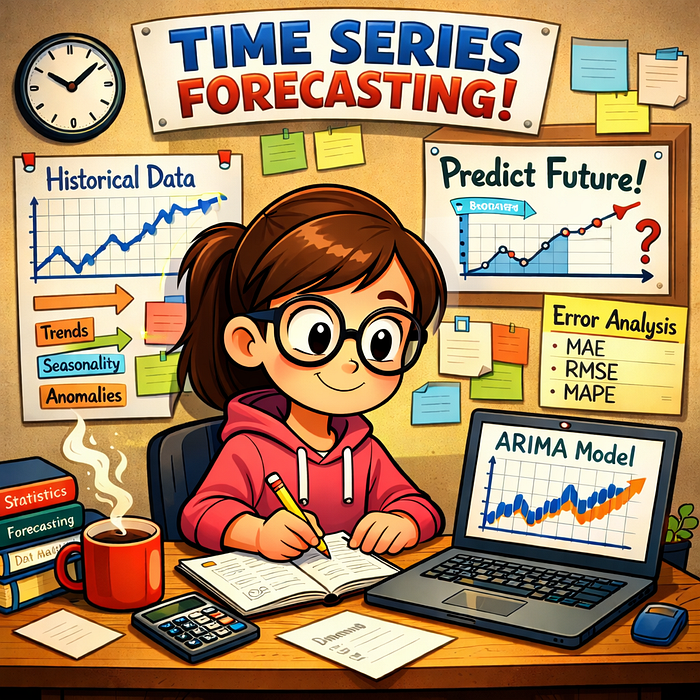 Time-series forecasting is the process of predicting future values ​​based on historical data collected over time at regular intervals. It focuses on identifying patterns such as trends (long-term increase or decrease), seasonality (repeating patterns), and random fluctuations. Models such as ARIMA, exponential smoothing, and modern machine learning approaches learn from past behavior to predict future outcomes. Time-series forecasting is widely used in demand planning, financial markets, weather forecasting, energy consumption, and production forecasting, where understanding how values ​​evolve over time is more important than the relationships between independent variables.